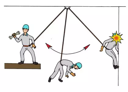 如果你系掛安全帶時,扣點(diǎn)不是自己位置正上方的話,發(fā)生墜落時將在空中出現(xiàn)擺動現(xiàn)象,并有可能撞到其它物體而造成傷害。所以扣掛時一定要選擇好扣點(diǎn),以避免發(fā)生這種“鐘擺效應(yīng)”。