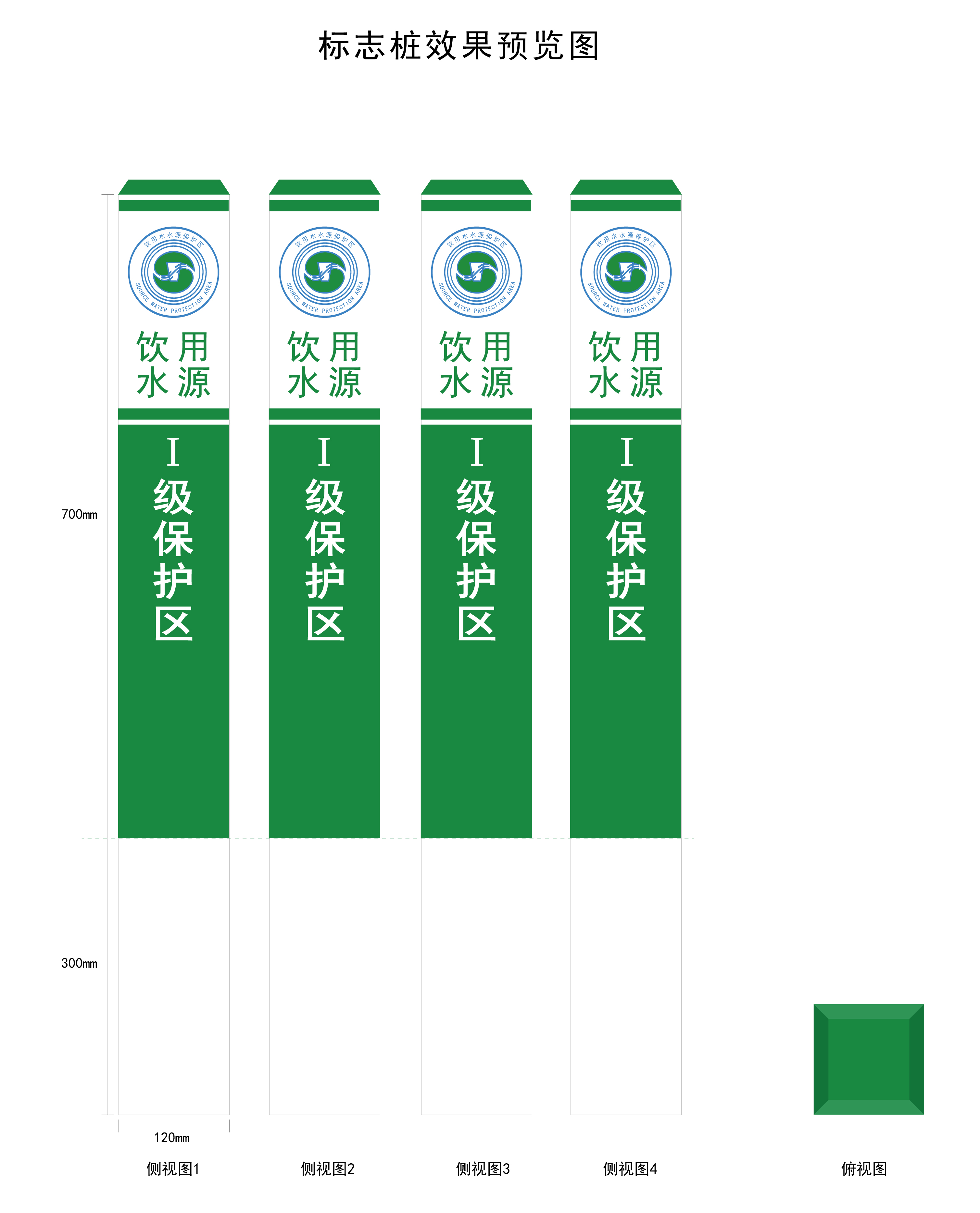 1、漸變色LOGO。2、樁體呈白綠色,印字加飲用水源保護區、電話信息等。
